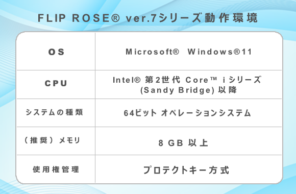 ・本製品を購入されますと、購入者は、FLIP ROSE(ver.7シリーズ)プログラムの譲渡不能、非独占的使用権を有することとなります。 (本製品とはコンピュータ・プログラム、プロテクトキー及びその取扱説明のマニュアルをいいます。)